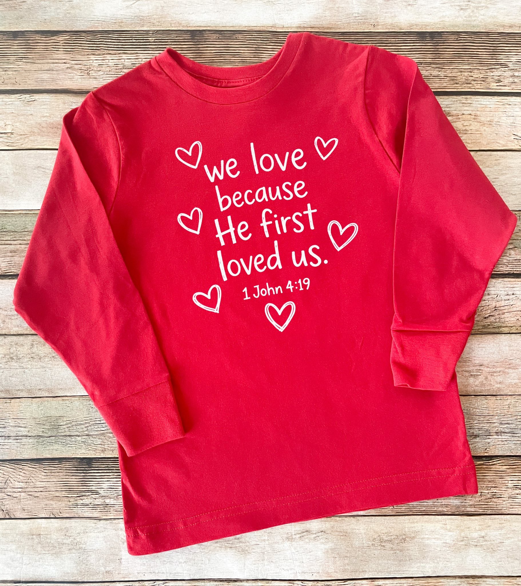 He First Loved Us design on Light Pink, Red, and Light Blue.